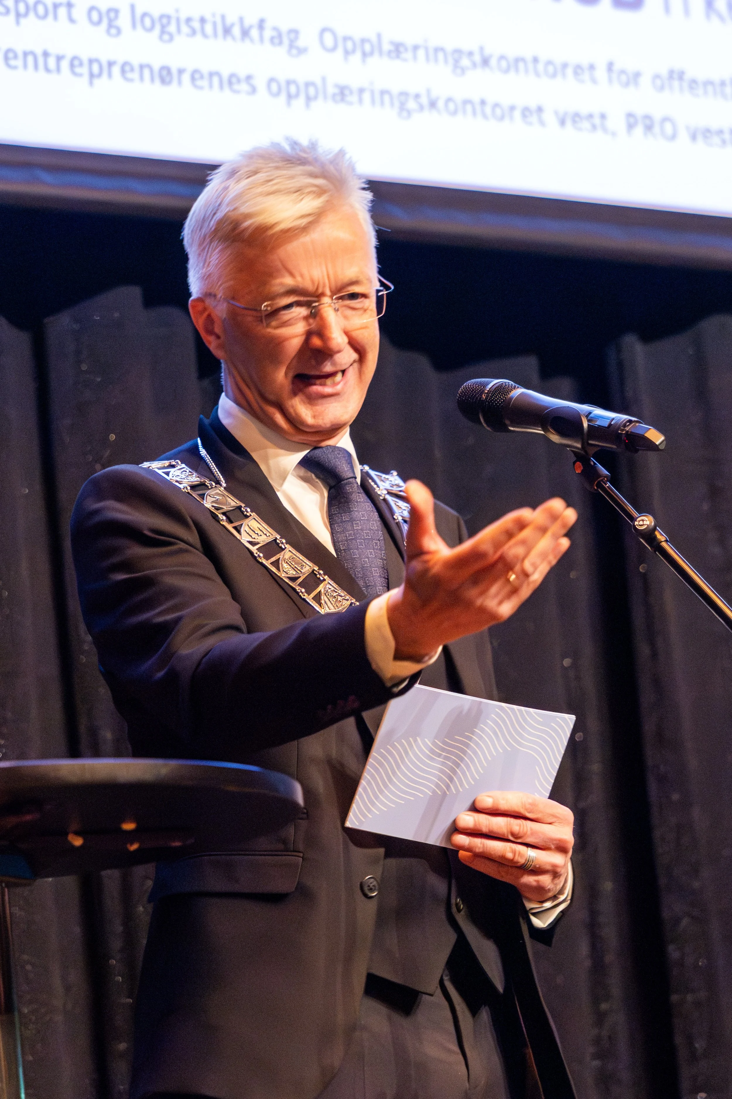 Fylkesordførar Jon Askeland skryt av ungdommen og hyller dei ferske fagarbeidarane. Foto: Ole Johnny Devik.
